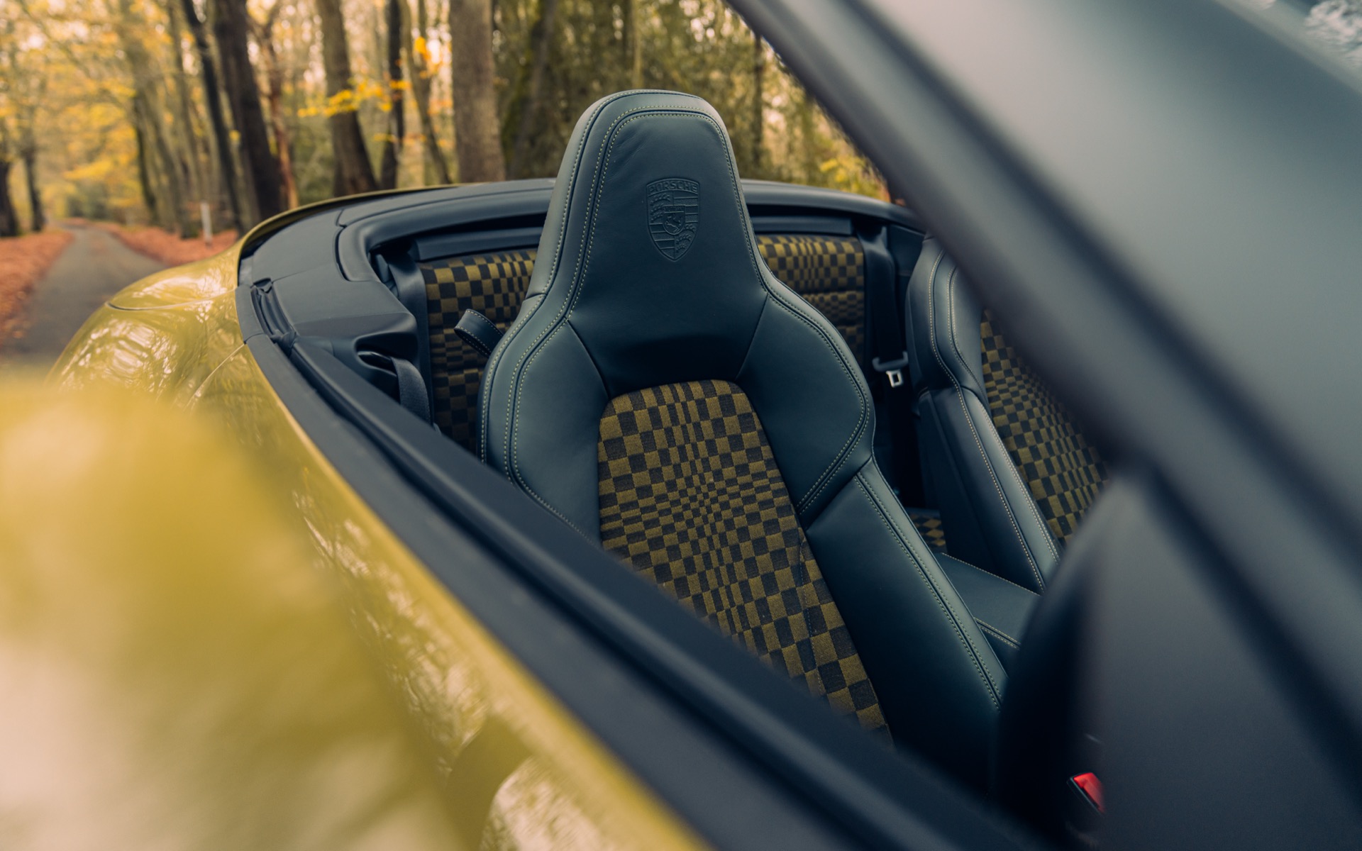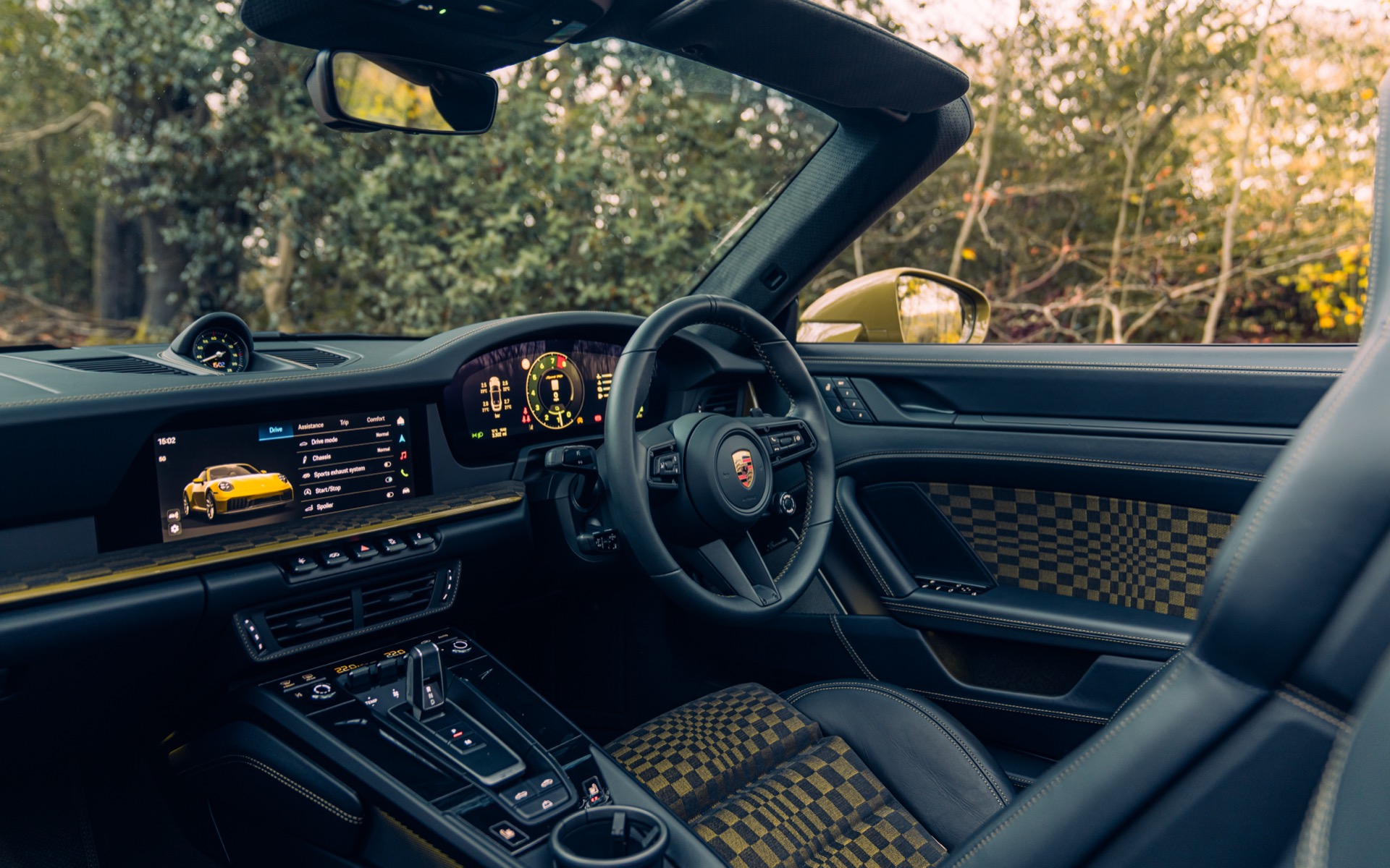 Inside, the theme becomes more obvious. Seat centers and door cards use period-inspired fabrics, matched with coordinated leather throughout the cabin. Heritage crests appear in embossed form, while plaques and detailing reinforce the narrative without disrupting daily usability. The switchgear and dials remain familiar, which helps keep the experience grounded. You still sit low and centered, exactly as a 911 should feel. Importantly, Porsche notes that fit and finish meet standard production levels, since these cars are built within normal factory processes rather than treated as bespoke one-offs.
