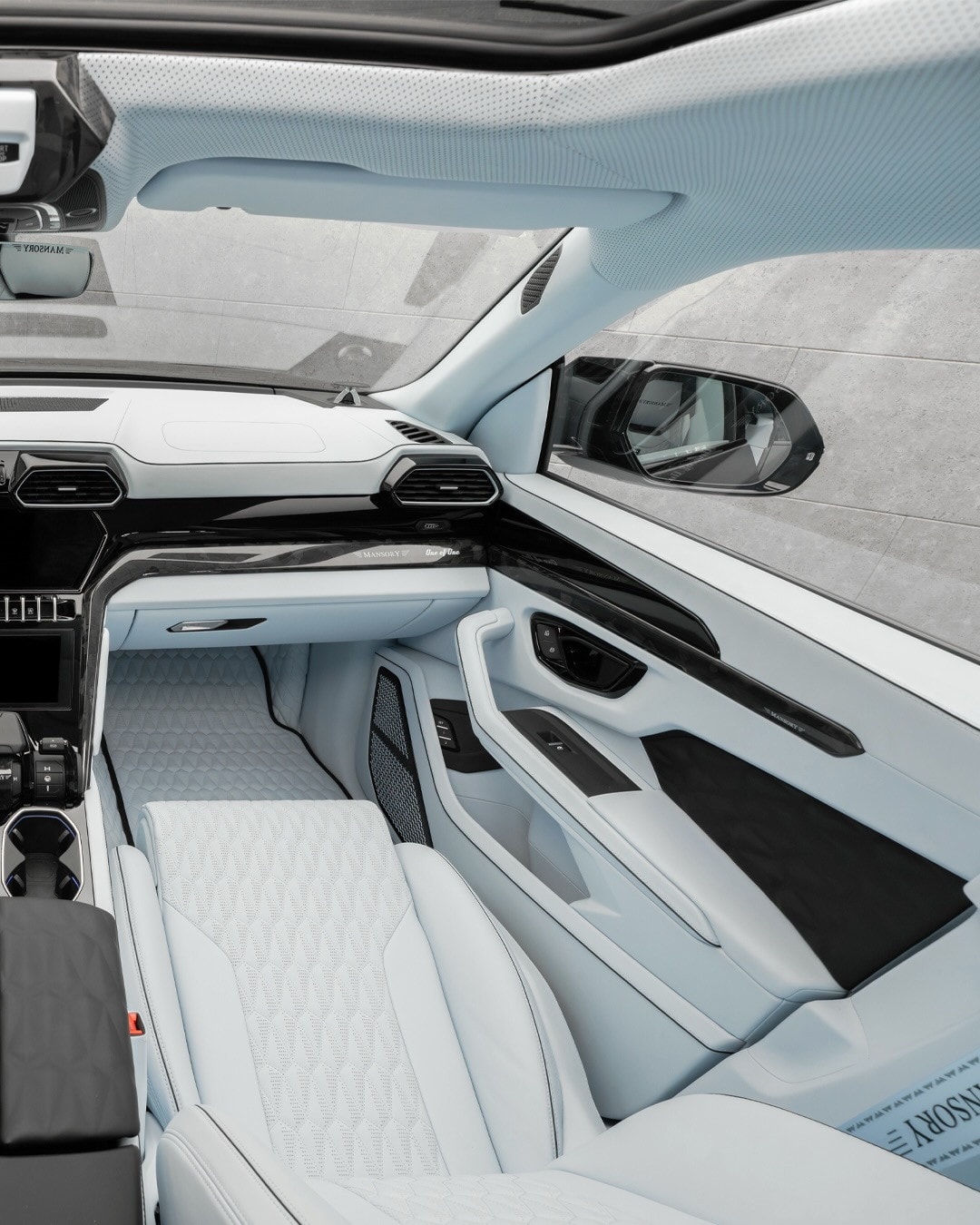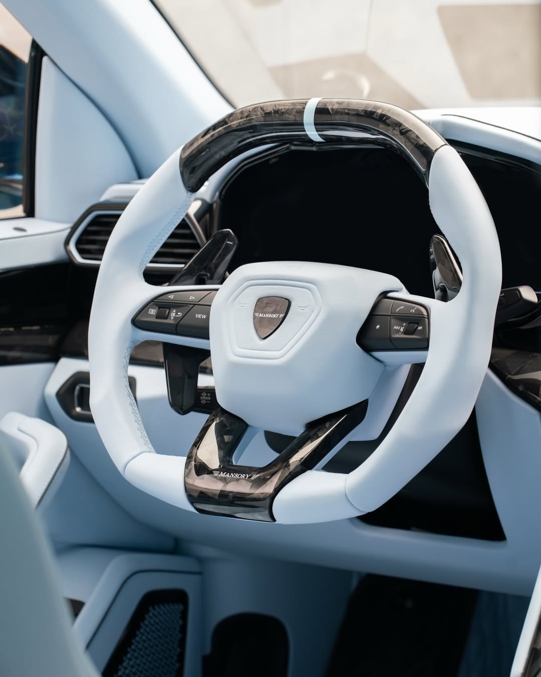 Inside, the color theme turns almost entirely light blue. Leather upholstery covers most visible surfaces, then black trim interrupts the tone in selected areas. Black piping outlines sections of the seats and panels, glossy black inserts sit nearby, and carbon fiber trim continues through the cabin. Mansory logos appear repeatedly across the interior.
