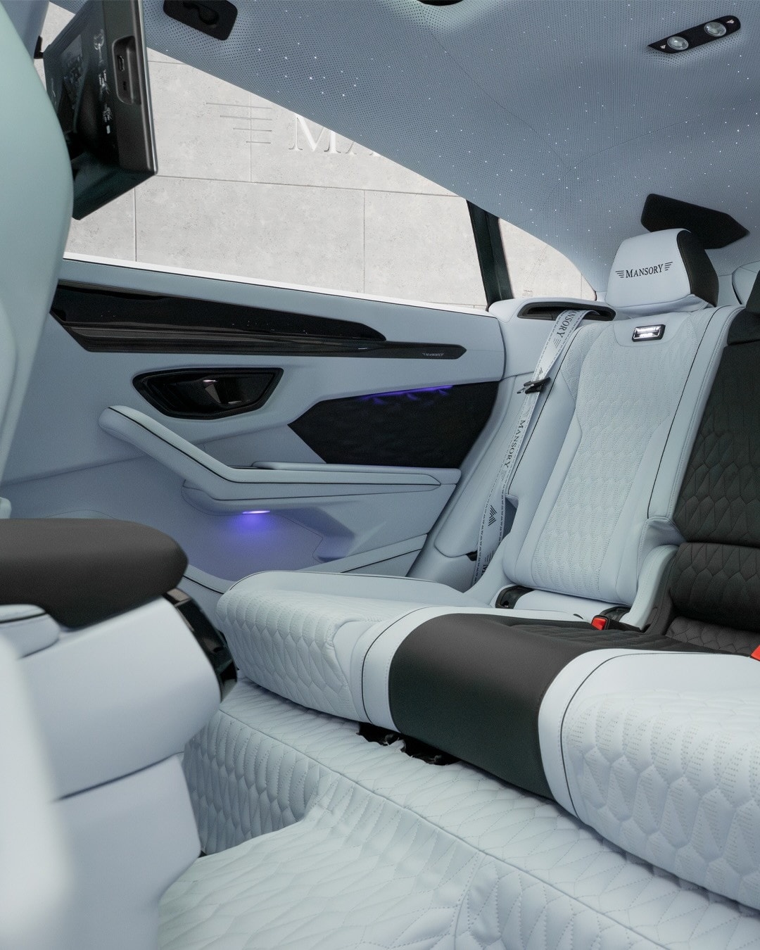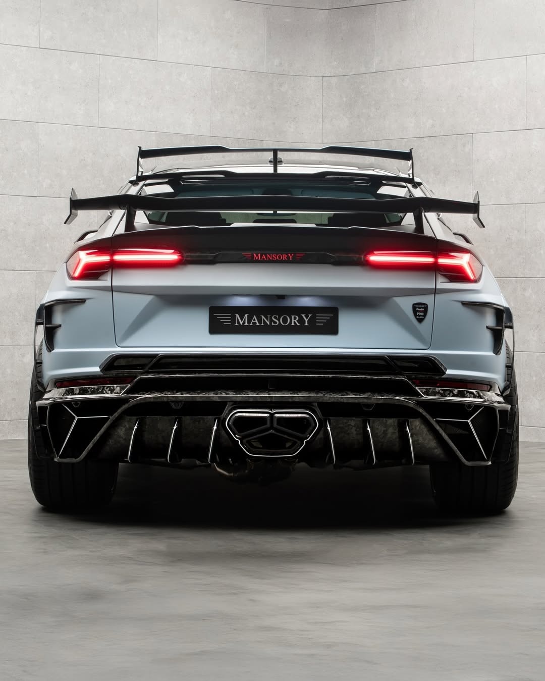 The rear section carries some of the strongest visual edits. A diffuser sits lower down and includes a large center opening for the exhaust outlets mounted in the middle. Between the taillights, the tuner placed an illuminated Mansory script. Another logo appears on the tailgate, while extra emblems spread across other exterior sections.