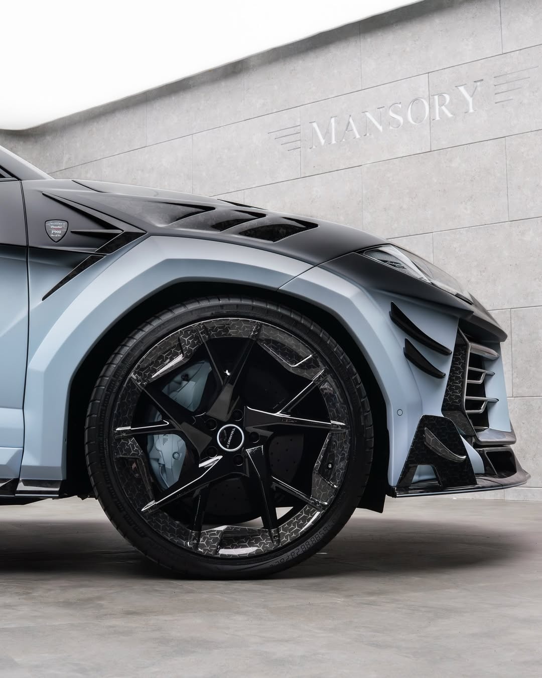 The front end moves far from the standard Urus form. The bumper receives added parts along the outer edges, Y-shaped daytime running lights, a chin spoiler, and vented front fenders. Several forged carbon elements appear across the body, mixed with a paint finish shifting from blue into black.